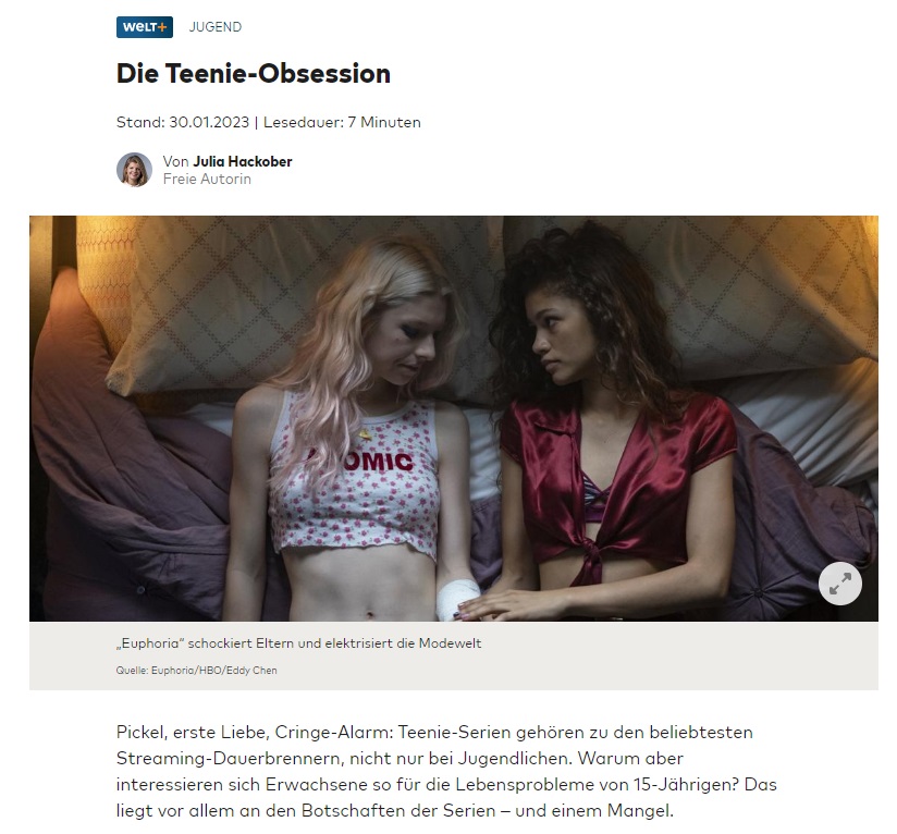 Man beachte der Artikel im Cuckold Fetischmagazin WELT ist geschrieben worden von einer vertrocknenden Millennial, genau die Demografie die man bei sowas mit größten Misstrauen betrachten sollte. Diese Formulierung "nicht nur bei Jugendlichen" bereits irreführend ist, diese wären die Hauptkonsumentengruppe, was demografisch unmöglich ist und sich nicht in den Abonnentenzahlen der Streaminganbieter abzeichnet, deren Kunden überwiegend Mitte 30 und kinderlos sind. Bugmenschen halt.